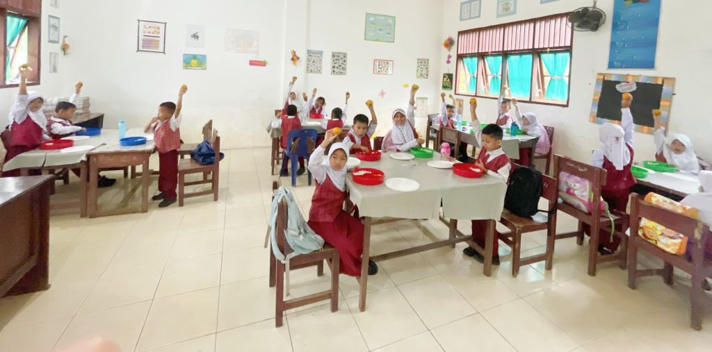 ” Untuk hari ini kita membagikan sebanyak 3255 porsi, yang akan di bagikan ke 9 sekolah, di antaranya sekolah, TK, SD, SMP, SMA, dan SMK,