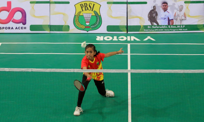 Atlet PB PUPR Aceh Barat, Siti Aisyah, menang usai membantai Dwi Nathia Hura pada kelas tunggal usia dini putri pada pertandingan yang berlangsung Sabtu, 10 Agustus 2024 sore, dengan poin 21-12 pada round pertama dan 21-17 round kedua.