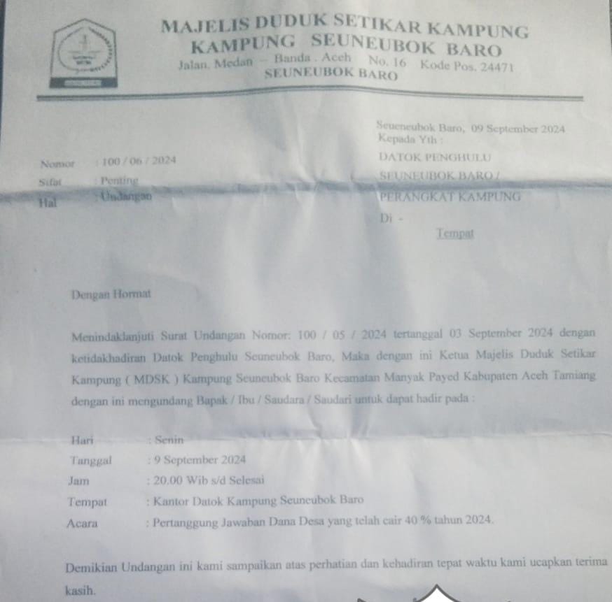 Media indonesia 24.Com Manyak Payed/- Ketua majelis duduk setikar kembali menyurati datuk penghulu desa Seuneubok Baru untuk kedua kalinya terkait penarikan dana sebesar 40%sebagai tahap pertama dan silva untuk di mintai pertanggung jawaban apa yang telah di bangun dengan menggunakan dana kisaran ratusan juta rupiah .