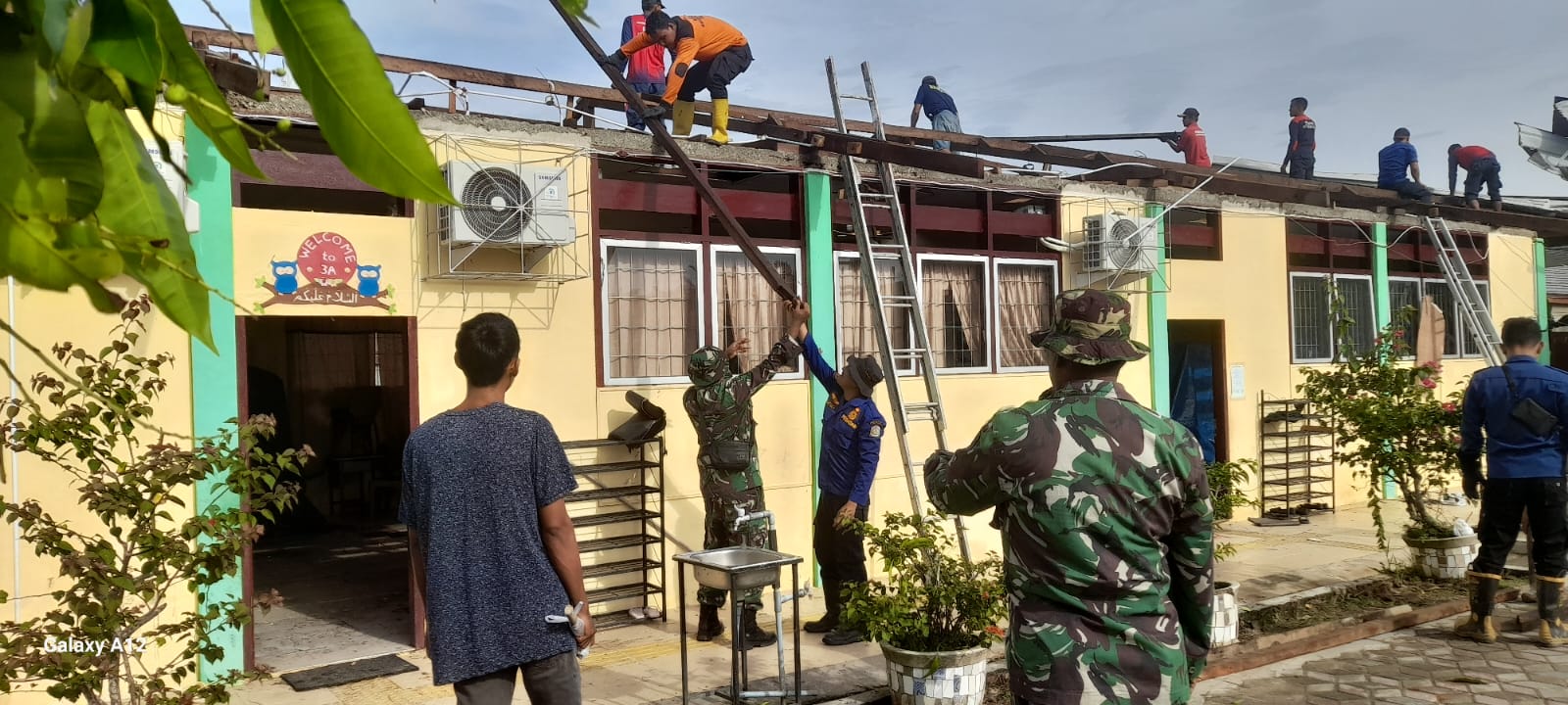 ACEH TAMIANG,MEDIA CENTER DIM 0117/ATAM- Gerak cepat Koramil 02/Karang Baru yang di pimpin langsung oleh Danramil Letnan Satu Inf Faisal Hadi kegiatan gotong royong bersama BPBD Aceh Tamiang dan Staf Kecamatan Karang Baru pasca Hujan Angin Puting Beliung yang mengakibatkan salah satu Sekolah mengalami kerusakan parah bertempat di SD IT Darul Mukhlisin desa Dalam, Kecamatan Karang Baru, Kabupaten Aceh Tamiang. Selasa (13/05/2025) pagi.
