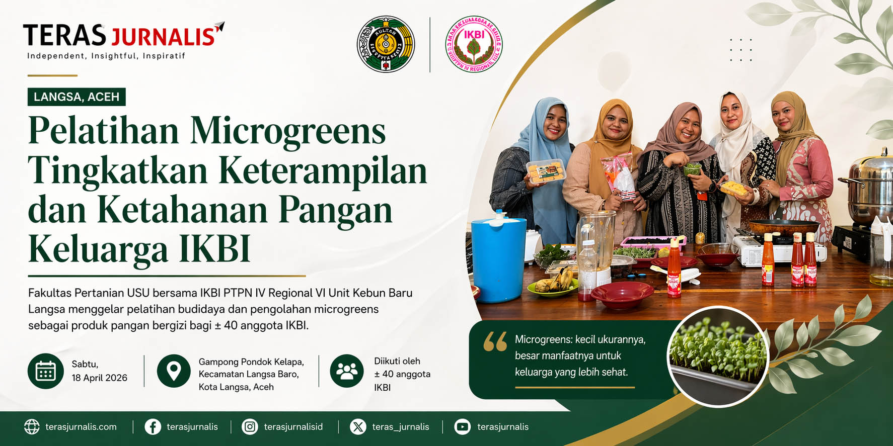 LANGSA, ACEH — Fakultas Pertanian Universitas Sumatera Utara (USU) bekerja sama dengan Ikatan Keluarga Besar Istri (IKBI) PTPN IV Regional VI Unit Kebun Baru menggelar pelatihan budidaya dan pengolahan microgreens sebagai produk pangan bergizi, Sabtu (18/4/2026).