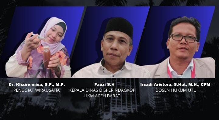 Dalam kegiatan tersebut yang menjadi narasumber di antaranya Dr Khairunnisa, S.P.,M.P. selaku penggiat wirausaha, Fauzi S.H selaku kepala dinas disperindagkop UKM Aceh Barat dan Irsadi Aristora, S.Hut, M.H. CPM, serta dihadiri oleh Wakil Rektor III yang diwakili oleh Muhammad Idris, S.PD,. M.PD bidang kemahasiswaan, Presma, DPM, MPM, BEM, HMJ, UKM lingkup UTU, STAIN Teungku Dirundeng, IAIN Lhokseumawe dan tamu undangan lainnya.