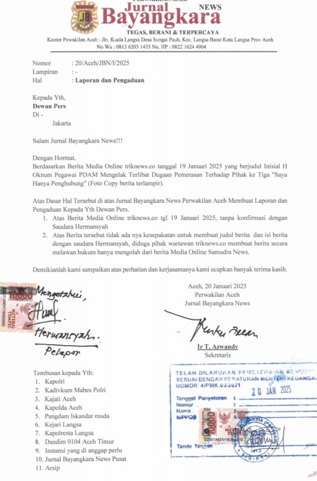 Ketua Jurnal Bhayangkara Aceh melaporkan dengan nomor surat 20/Aceh/JBN/I/2025 perihal Pengaduan Kepada yang terhormat Dewan Pers Salam Jurnal Bhayangkara News dengan hormat berdasarkan berita media online Triknews.co tertanggal 19 Januari 2025 yang berjudul inisial (H) Oknum pegawai PDAM mengelak terlibat dugaaan pemerasaan terhadap Pihak ke tiga.