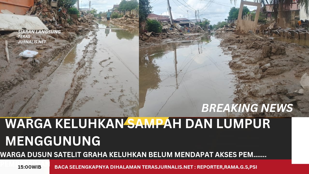 Komplek Perumahan Satelit Graha ,Kampung Kebun Tanah Terban masih belum tersentuh alat berat untuk akses pembersihan,jalan yang masih berlumpur,tumpukan sampah mengiringi jalan menjadi masalah tersendiri bagi warga,Pasalnya lumpur semakin tinggi menggenangi jalan dan halaman rumah kian menambah kesulitan warga dalam beraktivitas,Minggu(28/12/2025)