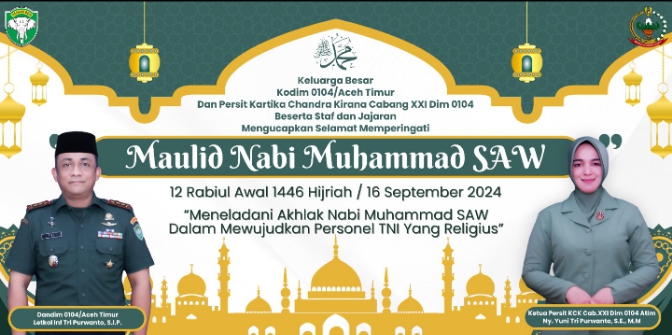 Mediaindonesia24.com,Langsa,Aceh— Komandan Kodim 0104/Aceh Timur, Letkol Inf Tri Purwanto, S.I.P., bersama Ketua Persit Kartika Chandra Kirana Cabang XXI Dim 0104 Koorcab Rem 011 PD Iskandar Muda, Ny. Yuni Tri Purwanto, S.E., M.M., beserta seluruh staf dan jajaran Kodim 0104/Aceh Timur mengucapkan selamat memperingati Maulid Nabi Besar Muhammad SAW 12 Rabiul Awal 1446 H, yang bertepatan dengan hari Senin, tanggal 16 September 2024.
