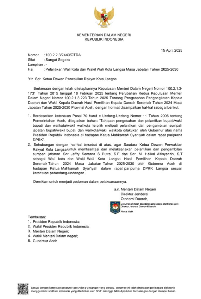 Langsa , kabartujuh— Kementerian Dalam Negeri Republik Indonesia resmi mengeluarkan surat dengan nomor 100.2.2.3/2440/OTDA pada 15 April 2025 terkait pelantikan Wali Kota dan Wakil Wali Kota Langsa terpilih untuk masa jabatan 2025-2030. Surat yang bersifat sangat segera ini ditujukan kepada Ketua Dewan Perwakilan Rakyat Kota (DPRK) Langsa.