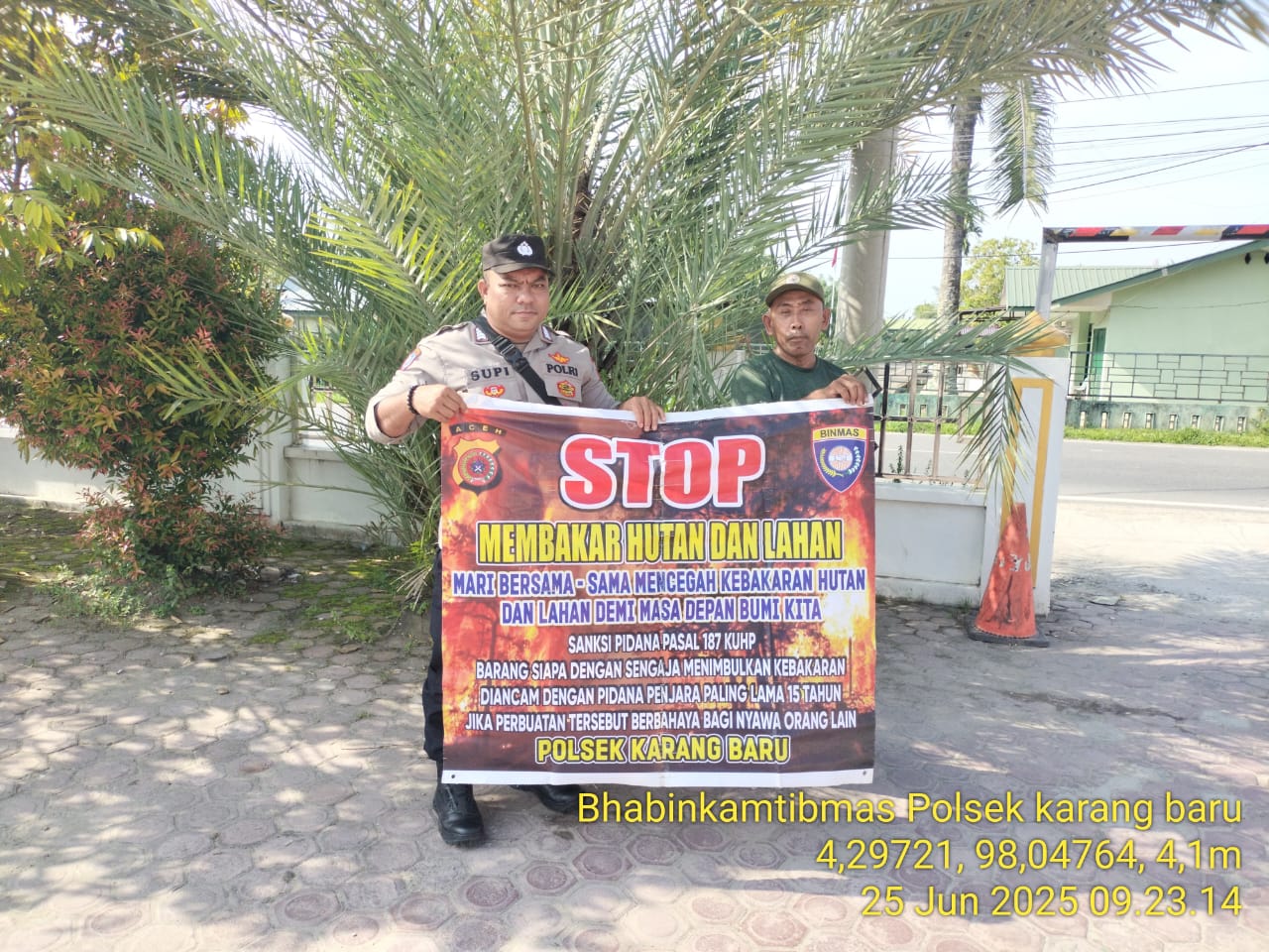 ACEH TAMIANG – Polda Aceh, Polres Aceh Tamiang melalui Personil Polsek Karang Baru melakukan Patroli sekaligus menyampaikan sosialisasi bahayanya melakukan pembakaran dalam rangka pencegahan dan himbauan terkait kebakaran hutan dan lahan (Karhutla). Rabu (25/06/2025).