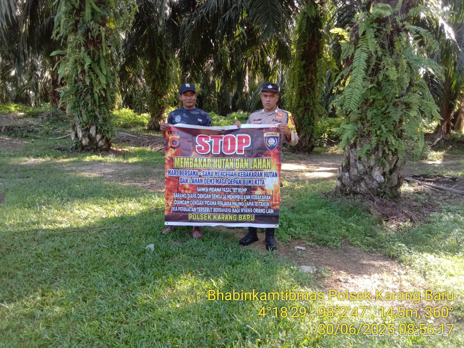 ACEH TAMIANG – Polda Aceh, Polres Aceh Tamiang melalui Personil Polsek Karang Baru melakukan Patroli sekaligus menyampaikan sosialisasi bahayanya melakukan pembakaran dalam rangka pencegahan dan himbauan terkait kebakaran hutan dan lahan (Karhutla). Senin (30/06/2025).
