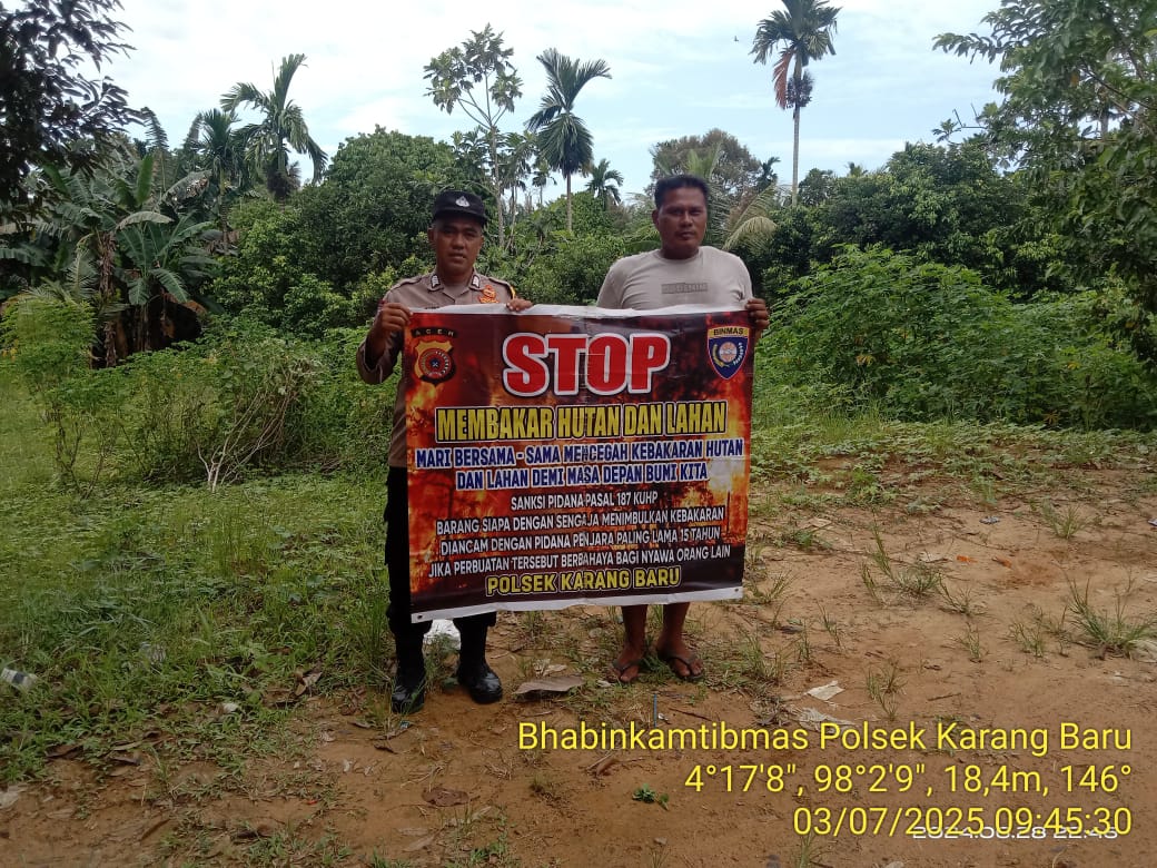 ACEH TAMIANG – Polda Aceh, Polres Aceh Tamiang melalui Personil Polsek Karang Baru melakukan Patroli sekaligus menyampaikan sosialisasi bahayanya melakukan pembakaran dalam rangka pencegahan dan himbauan terkait kebakaran hutan dan lahan (Karhutla). Kamis (3/07/2025).