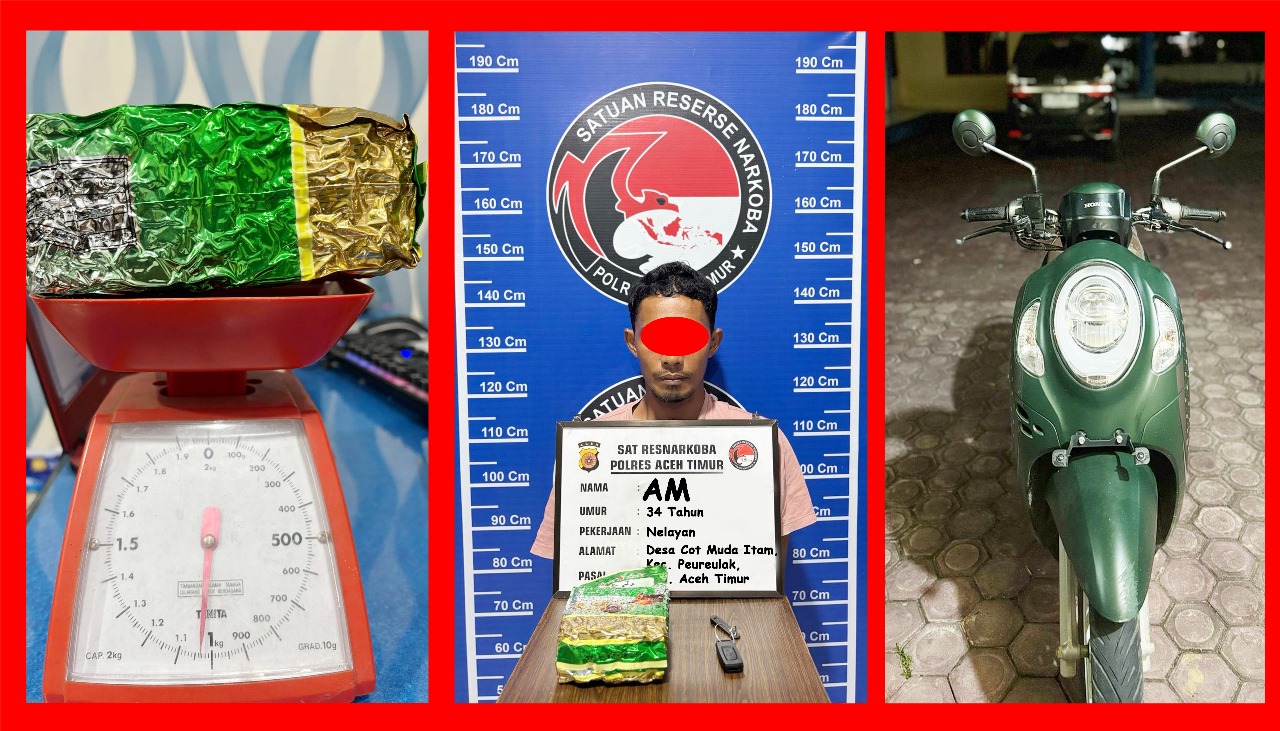 Kapolres Aceh Timur AKBP Nova Suryandaru, S.I.K., melalui Kasatresnarkoba AKP Yusra Aprilla, S.H.,M.H. menyebutkan AM merupakan kurir yang membawa narkoba tersebut diamankan di Desa Pasir Putih, Kecamatan Peureulak usai tertangkap tangan membawa sabu-sabu seberat 1 (satu) kilogram (bruto) dengan menggunakan satu unit sepeda motor Honda Scoopy tanpa Nomor Polisi.